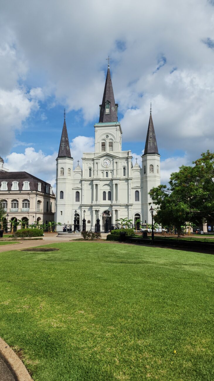 At the rear of the square stands the magnificent St. Louis Cathedral, a true architectural marvel that serves as a magnet for tourists and locals alike. Upon reaching Jackson Square and casting your gaze toward the west, you can’t help but be captivated by the cathedral’s stunning façade, beckoning you to come inside. The white stone building rises majestically, flanked by two elegantly designed spires that reach for the sky, each gracefully supporting the prominent tallest spire, crowned with a gleaming cross. At first glance, one might not suspect the building’s tumultuous history, having undergone numerous renovations due to the ravaging effects of fire. This cathedral is still hauntingly beautiful. Upon crossing the threshold, you are enveloped in a profound sense of serenity—an experience that transcends religious beliefs. The altar gleams with a golden aura, yet the candles are not lit during this time of day. Many find tranquility and reflection within these hallowed walls, where intricate carvings of saints and biblical scenes capture the imagination. The checkered floor and wooden pews invite you to sit still for a while. Breathe in the smell of frankincense and myrrh, which lingers in the air from Morning Mass. Don’t forget to return to the vibrant life outside, where Jackson Square continues to pulse with energy.
