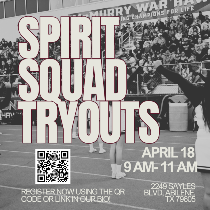 Have you ever thought about being part of the McMurry Cheer or Dance Team? Now’s your chance! Both teams are looking for motivated and energetic students who want to represent the university, support War Hawk Athletics, and be part of a high-energy team environment. If you are interested, tryouts will take place next Saturday, April 18th from 9 – 11 a.m.